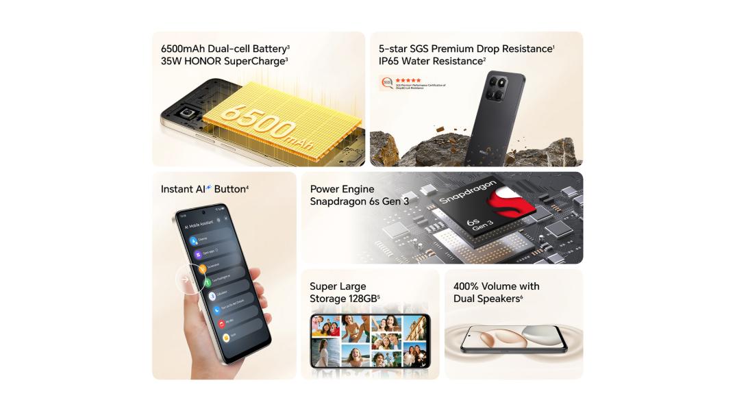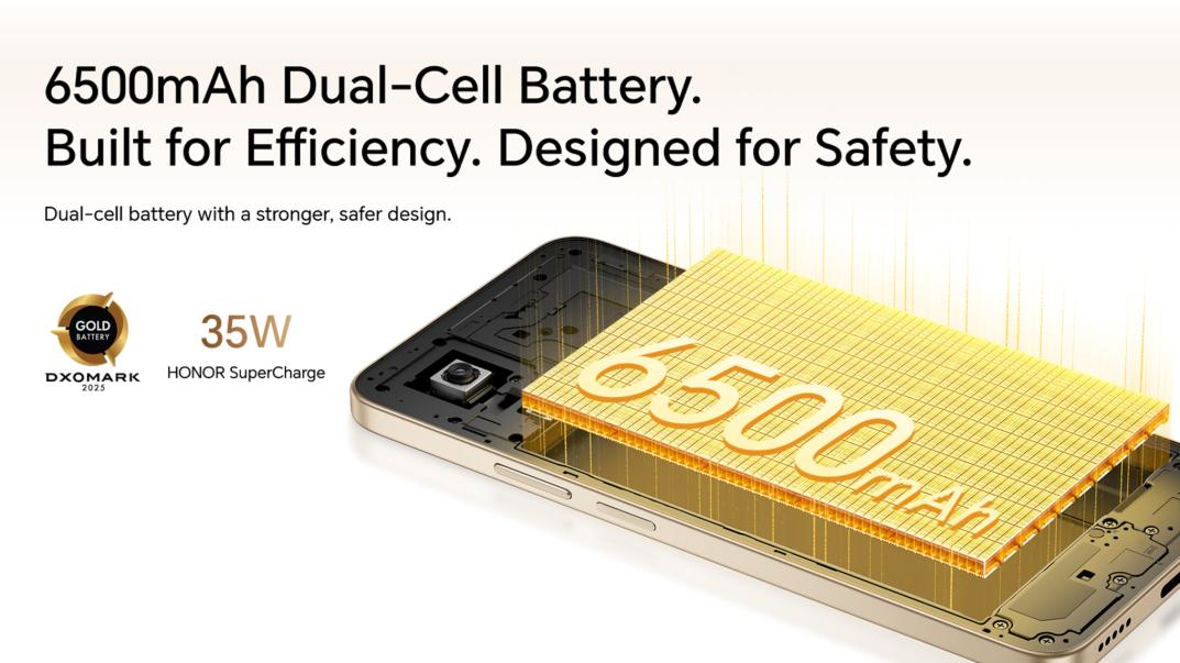 Capacity 6350mAh (rated value), 6500 mAh (typical value) *This capacity is the nominal battery capacity. The actual battery capacity for each individual phone may be slightly above or below the nominal battery capacity. Type Lithium-ion polymer battery Wired Charging Supported 35W *The actual charging power may vary with different scenarios intelligently. Please refer to actual situations. Standard Charger 35W HONOR SuperCharge *The actual charging power may vary with different scenarios intelligently. Please refer to actual situations.