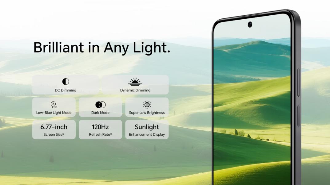 Size 6.77 inches *With a rounded corners design on the display, the diagonal length of the screen is 6.77 inches when measured according to the standard rectangle (the actual viewable area is slightly smaller). Color 16.7 million colors, 85%NTSC Type TFT LCD Eye Comfort Technology Eye Comfort/Dynamic Dimming *This product is not a medical device and does not have therapeutic functions Resolution 1610*720 Brightness 850nit(HBM)/700nit(Typical)