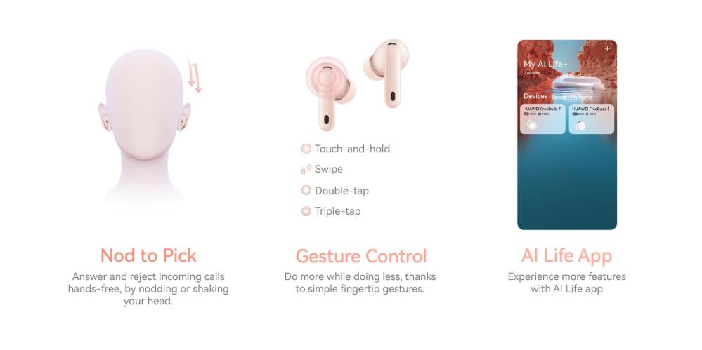 Double-tap: play audio/pause audio/answer a call/end a call; Triple tap: skip to the next track; Swipe: increase the volume/decrease the volume; Touch-and-hold: switch between noise cancellation modes/reject a call;