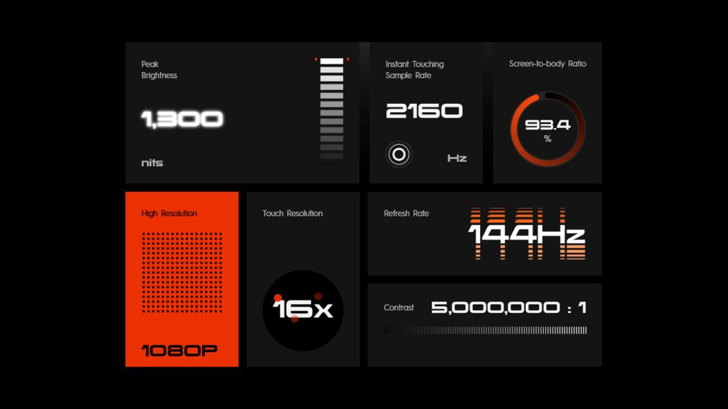 AMOLED, 144Hz, 2304Hz PWM, 1300 nits (peak)