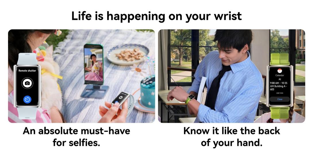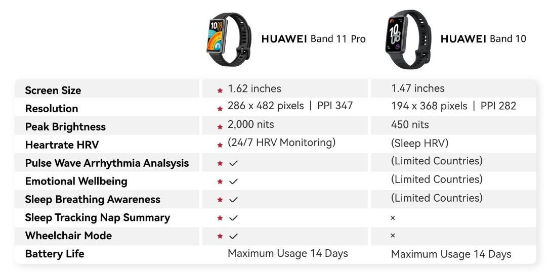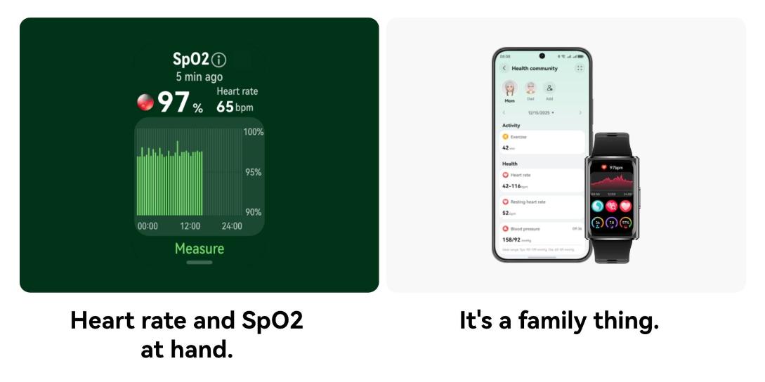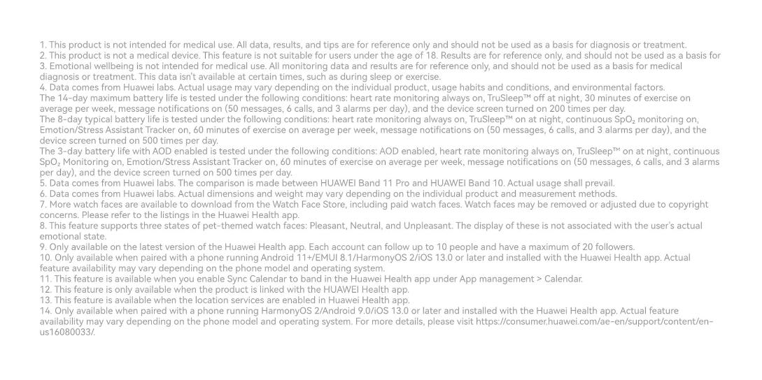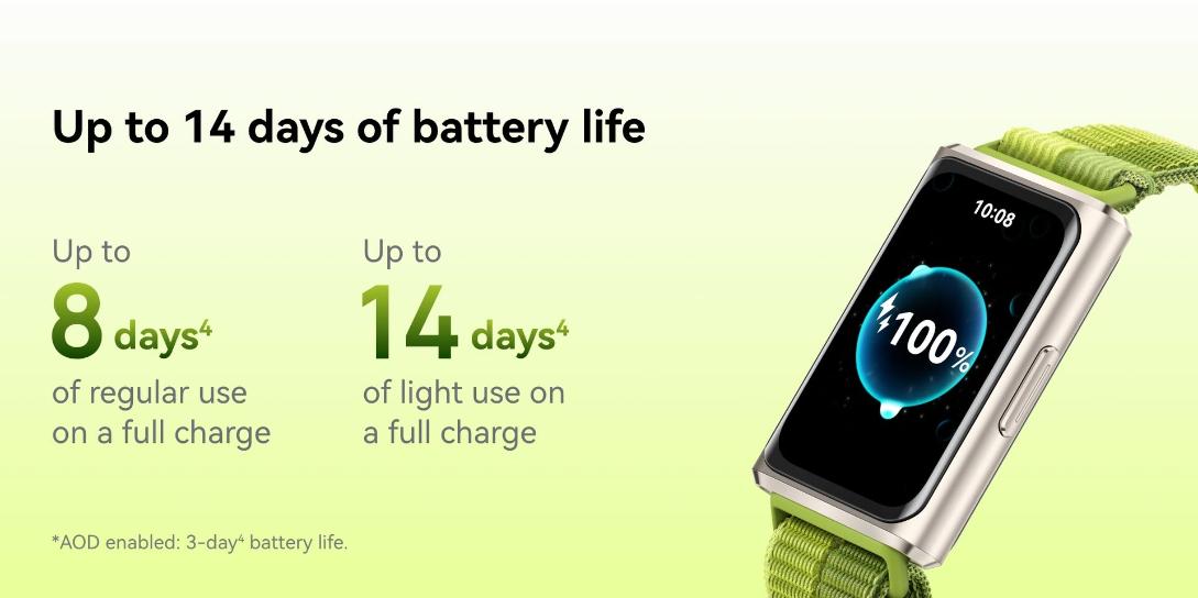 The device can last for a maximum of 14 days. Heart rate monitoring is enabled, HUAWEI TruSleep™ is disabled. Screen is checked briefly 200 times per day, 50 messages, 6 calls and 3 alarms reminding in 24 hours, and workout for 30 minutes per week. The device can last for up to 8 days under typical usage. heart rate monitoring always on, TruSleep™ on at night, continuous SpO₂ Monitoring on, Emotion / Stress Assistant Tracker on, 60 minutes of exercise on average per week, message notifications on (50 messages, 6 calls, and 3 alarms per day), and the device screen turned on 500 times per day. The device can last for up to 3 days when AOD is on. AOD enabled, heart rate monitoring always on, TruSleep™ on at night, continuous SpO₂ Monitoring on, Emotion / Stress Assistant Tracker on, 60 minutes of exercise on average per week, message notifications on (50 messages, 6 calls, and 3 alarms per day), and the device screen turned on 500 times per day. *Data comes from HUAWEI labs. Actual usage may vary depending on the specific product, usage habits, and environmental factors.