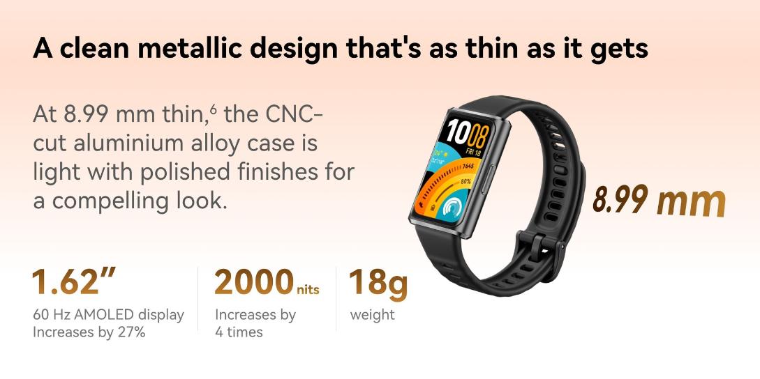 43.5×28.2×8.99 *8.99 mm is the thickness of the band measured at its thinnest point (the distance from the surface of the watch to the bottom cover, and does not include the sensor area). *Product size, product weight, and related specifications are theoretical values only. Actual measurements between individual products may vary. All specifications are subject to the actual product.